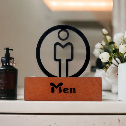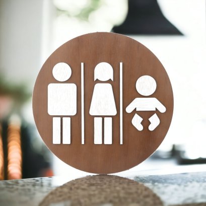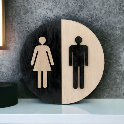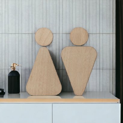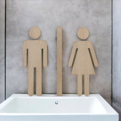 ขนาด 15 x 14.6 ซม. และ 18 x 17.5 ซม. ไม้แท้ และ อะคริลิค หนา 3 มม. ป้ายห้องน้ำชาย และ หญิง